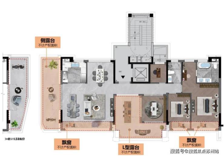 以建面约152㎡(部分)的中叠为例,不仅设计南北两大双露台,观景生活晾晒功能两不误,还将北露台进深从1.75米扩大到2.85米,外拓的1.1米空间,足够摆上桌椅,一本书,一杯茶,享受下午落日时光。